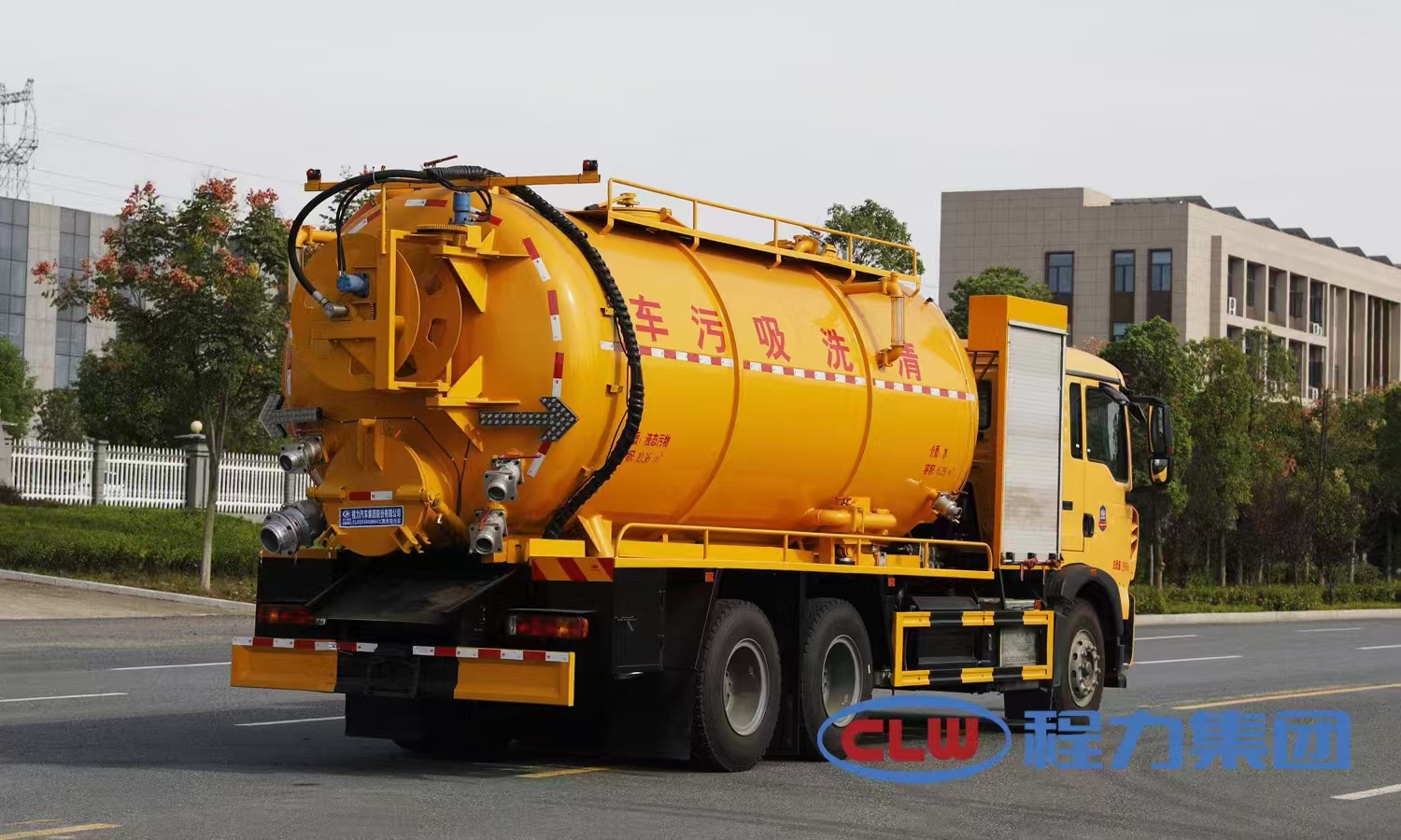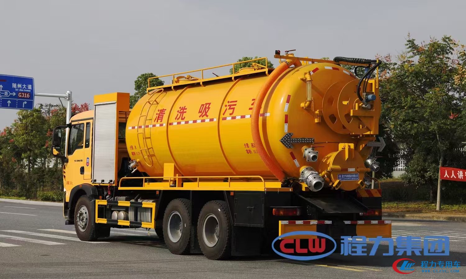上裝配置 罐體容積22立方左右,清水罐5立方,其余為污水,罐體8mm厚,封頭8mm厚,舉升頂為自卸中置頂,副駕駛一側(cè)清水罐和污水罐用DN100球閥互通,另罐頂裝一個(gè)互通,副駕駛一側(cè)按照公告圖片安裝爬梯; 清水罐:品浮350高壓泵,罐頂水車罐口一個(gè),帶爬梯,高壓管100米22號(hào)高壓管,尾部液壓卷盤,左右各裝一個(gè)消防栓進(jìn)水口,清水罐裝兩側(cè)各一個(gè)小球閥,罐底裝一個(gè)DN65排水閥, 吸污罐:一個(gè)散水罐口,罐體內(nèi)部鋪1.2米不銹鋼板,罐內(nèi)爬梯,罐體內(nèi)部防浪板加固,水循環(huán)泵水箱為碳鋼材質(zhì),副駕側(cè)排150鋁合金球閥,吸污罐尾部不開(kāi)大蓋,開(kāi)600小蓋排污口,尾部600小蓋左側(cè)一個(gè)150排污口,右側(cè)一個(gè)100的進(jìn)料口,一個(gè)100鋁合金排污口,側(cè)邊一個(gè)100排清水,罐體尾部?jī)蓚?cè)工具箱,1根10米吸污管,箭頭燈,手動(dòng)油門。